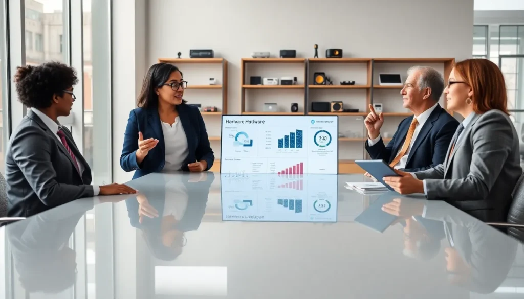 a diverse team discussing hardware web technologies in a modern office.